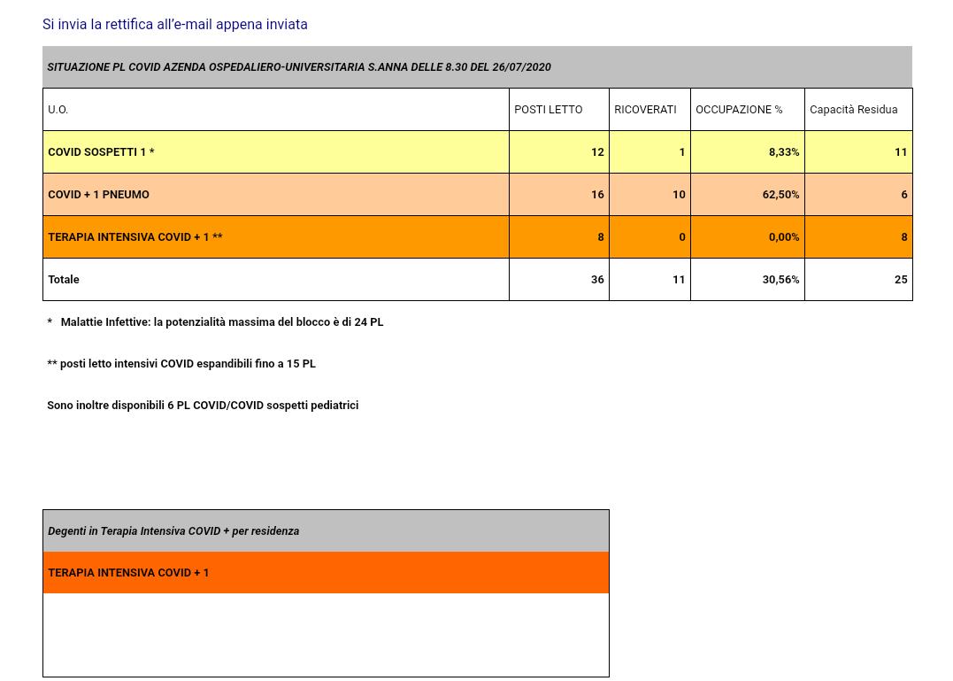 Situazione posti letto reparti Covid - 26 luglio 2020 - ore 8.30