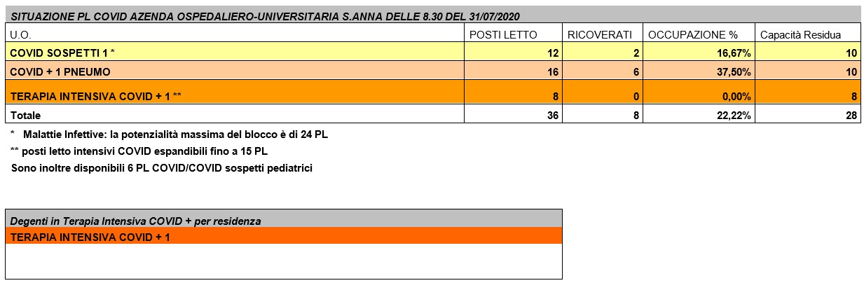 Situazione posti letto reparti Covid - 31 luglio 2020 - ore 8.30