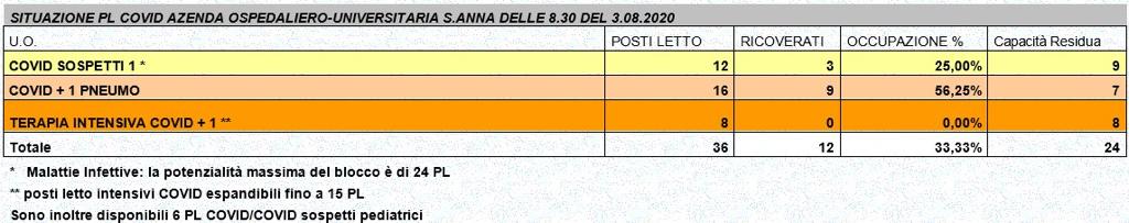 Situazione posti letto reparti Covid - 3 agosto 2020 - ore 8.30