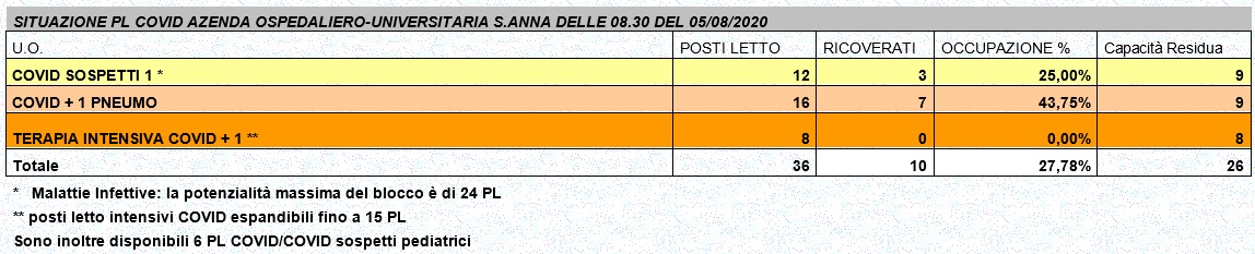 Situazione posti letto reparti Covid - 5 agosto 2020 - ore 8.30