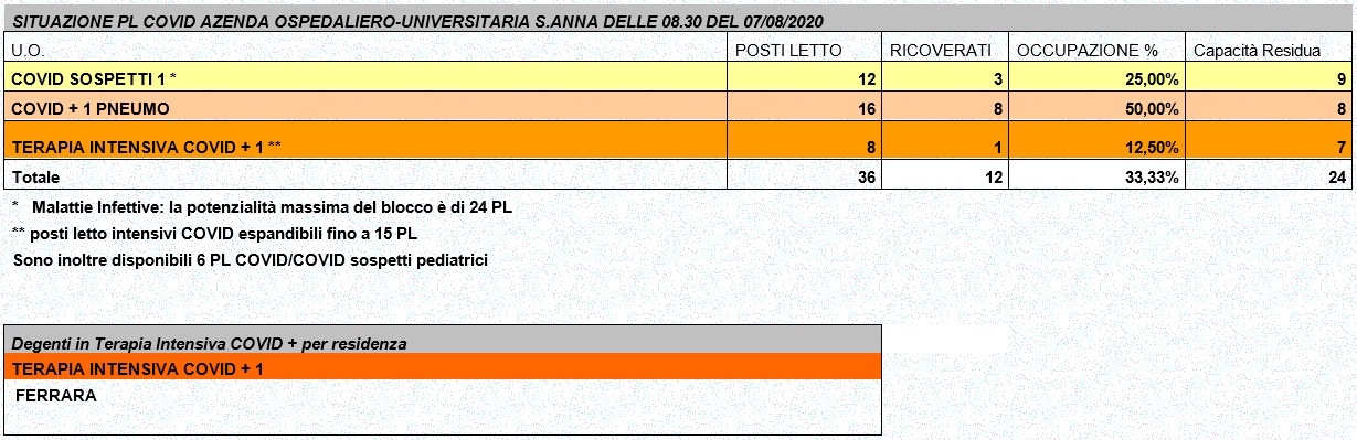Situazione posti letto reparti Covid - 7 agosto 2020 - ore 8.30