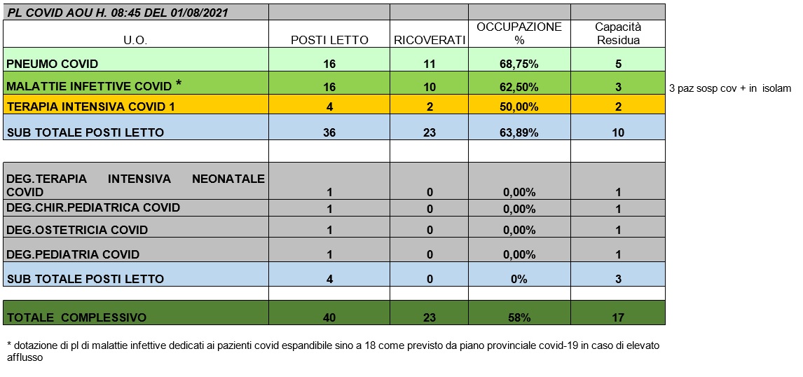 Situazione posti letto reparti Covid 1 agosto 2021 - ore 8.45.jpg
