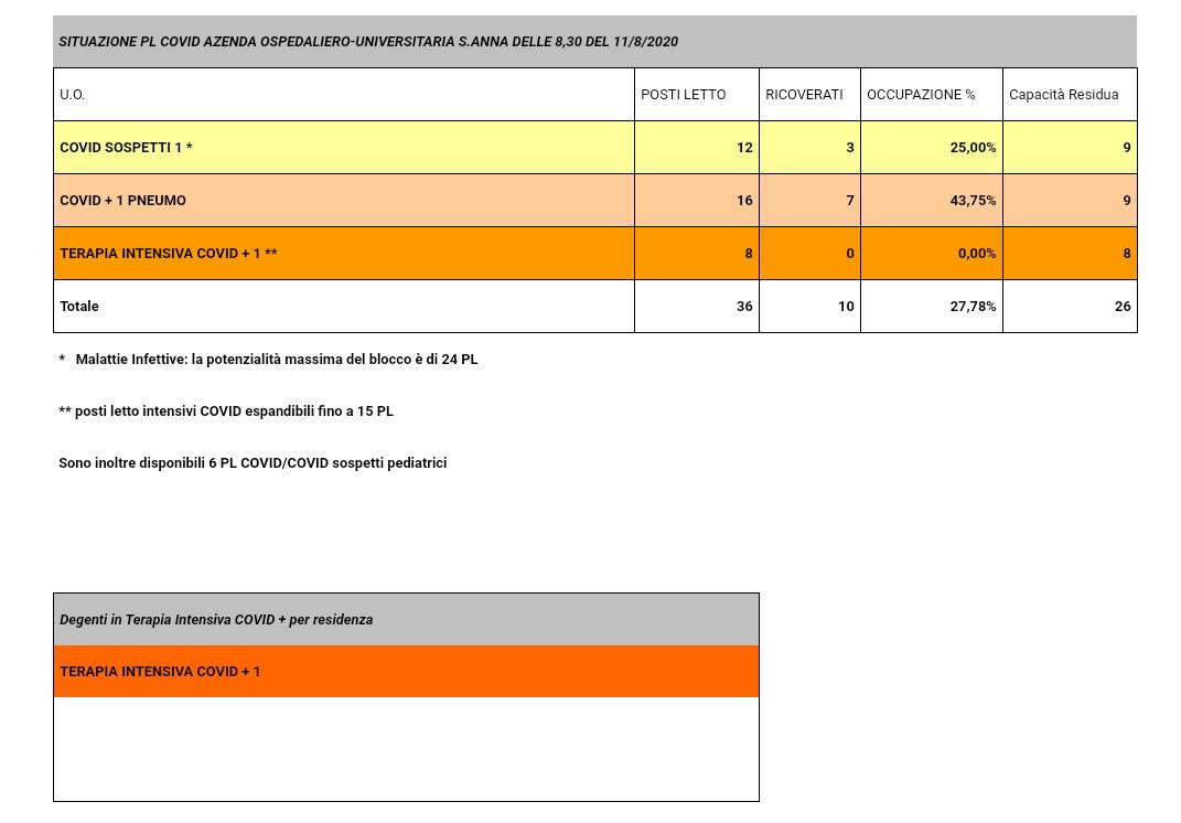 Situazione posti letto reparti Covid - 11 Agosto 2020 - ore 8.30