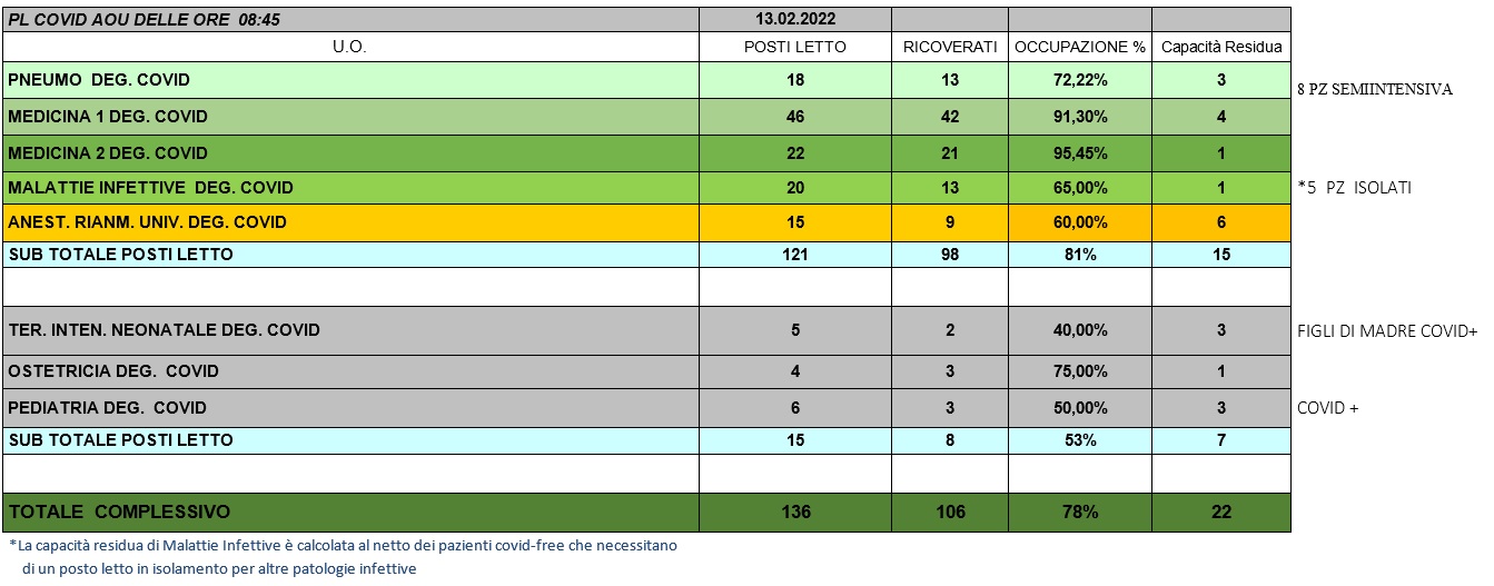 Situazione posti letto reparti Covid 13 Febbraio 2022 - ore 8.45.jpg