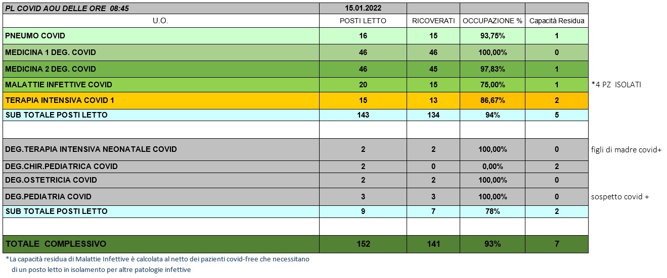 Situazione posti letto reparti Covid 15 Gennaio 2022 - ore 8.45.jpg