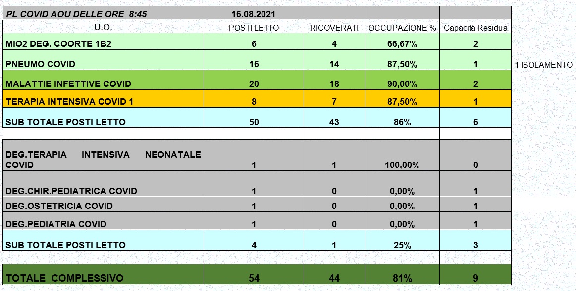 Situazione posti letto reparti Covid 16 Agosto 2021 - ore 8.45.jpg