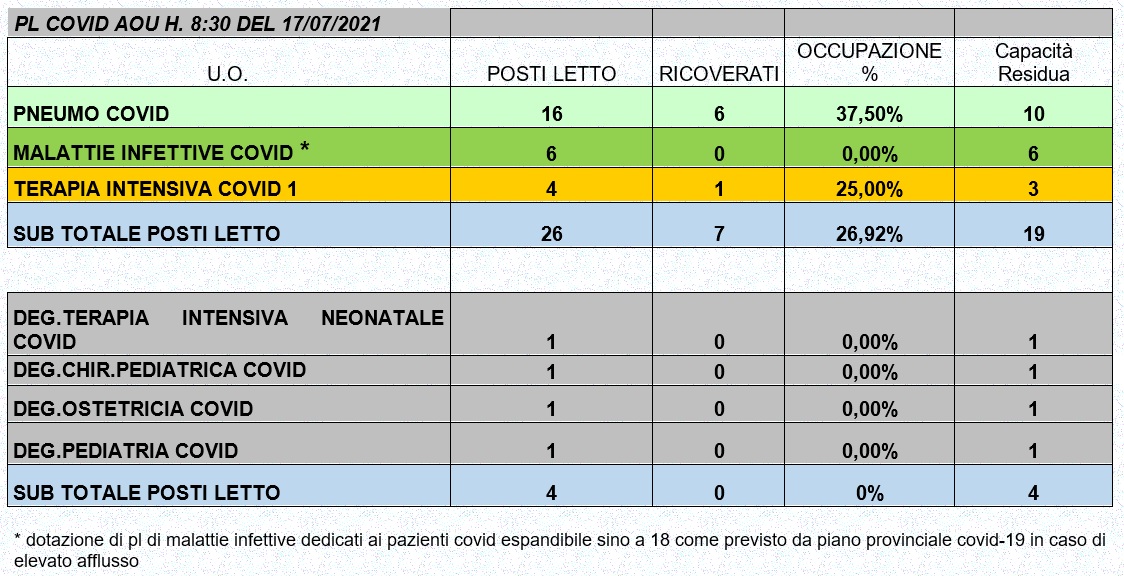 Situazione posti letto reparti Covid 17 luglio 2021 - ore 8.30.jpg