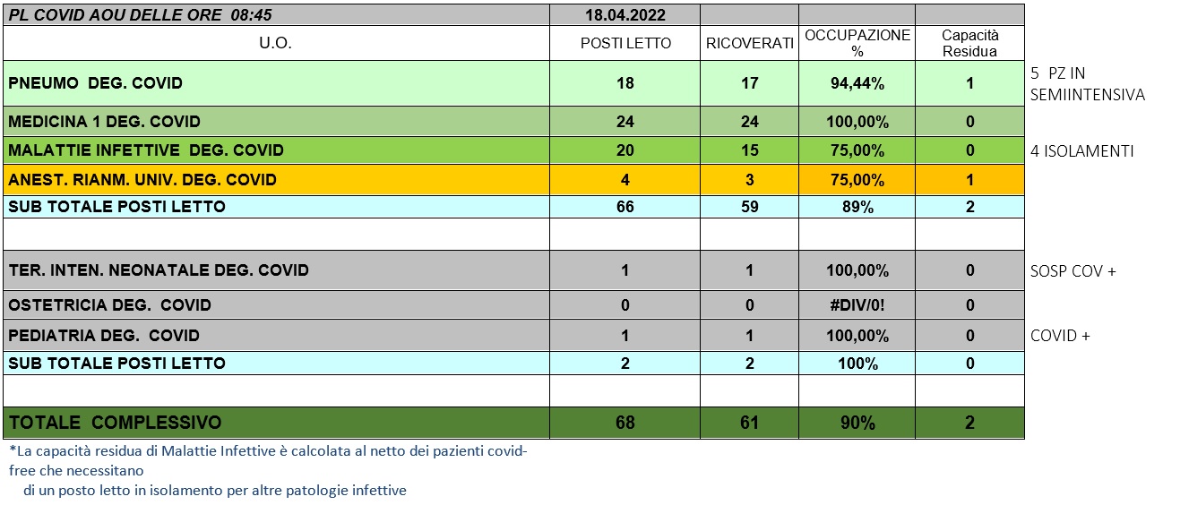 Situazione posti letto reparti Covid 18 aprile 2022 - ore 8.45.jpg