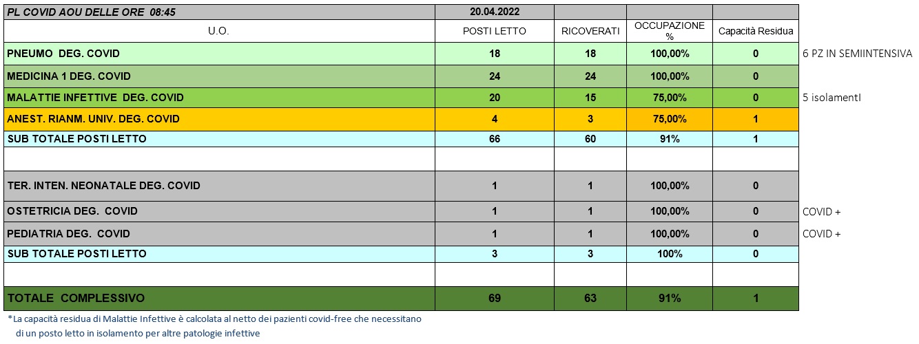 Situazione posti letto reparti Covid 20 aprile 2022 - ore 8.45.jpg