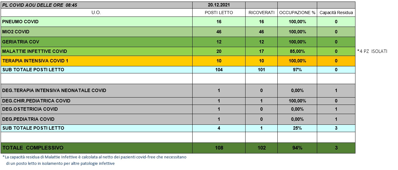 Situazione posti letto reparti Covid 20 dicembre 2021 - ore 8.45.jpg
