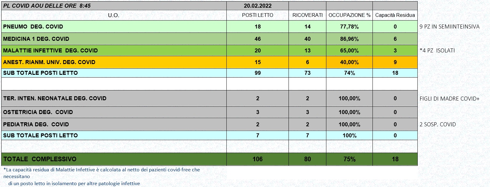 Situazione posti letto reparti Covid 20 Febbraio 2022 - ore 8.45.jpg