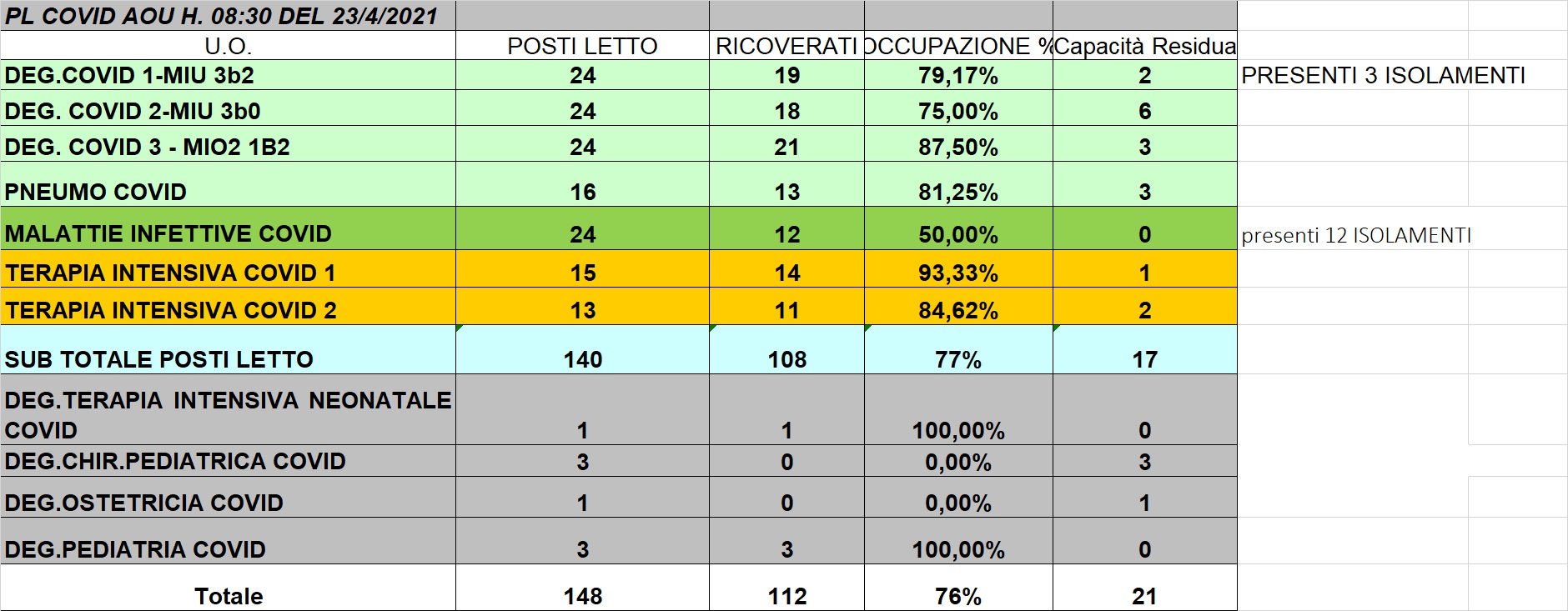 Situazione posti letto reparti Covid 23 aprile 2021 - ore 8.30.jpg