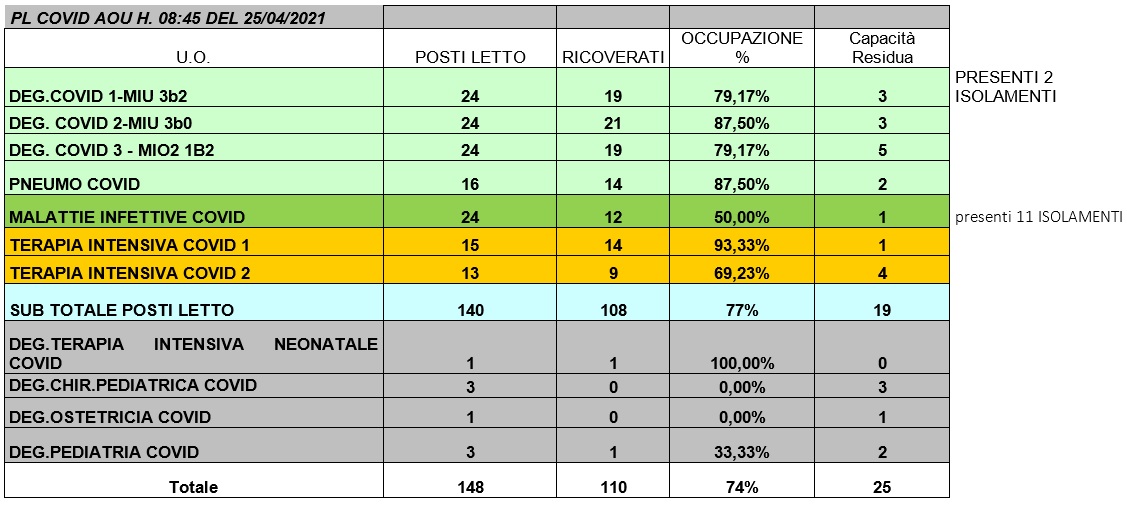 Situazione posti letto reparti Covid 25 aprile 2021 - ore 8.45.jpg