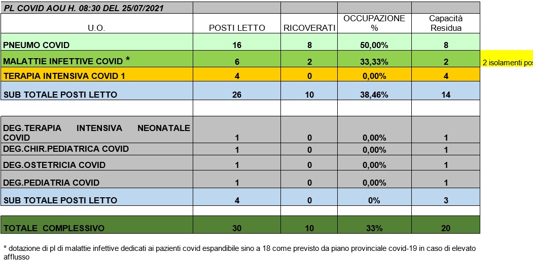 Situazione posti letto reparti Covid 25 luglio 2021 - ore 8.30.jpg