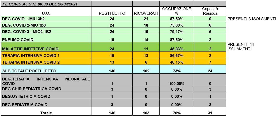 Situazione posti letto reparti Covid 26 aprile 2021 - ore 8.30.jpg