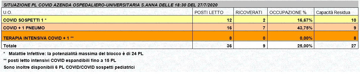 Situazione posti letto reparti Covid - 27 luglio 2020 - ore 18.30