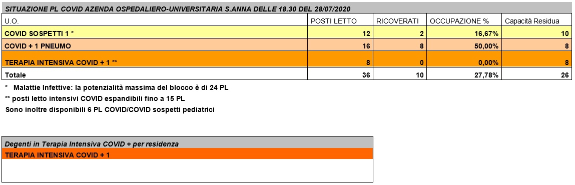 Situazione posti letto reparti Covid - 28 luglio 2020 - ore 18.30
