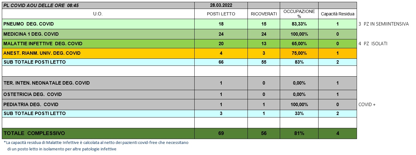 Situazione posti letto reparti Covid 28 marzo 2022 - ore 8.45.jpg