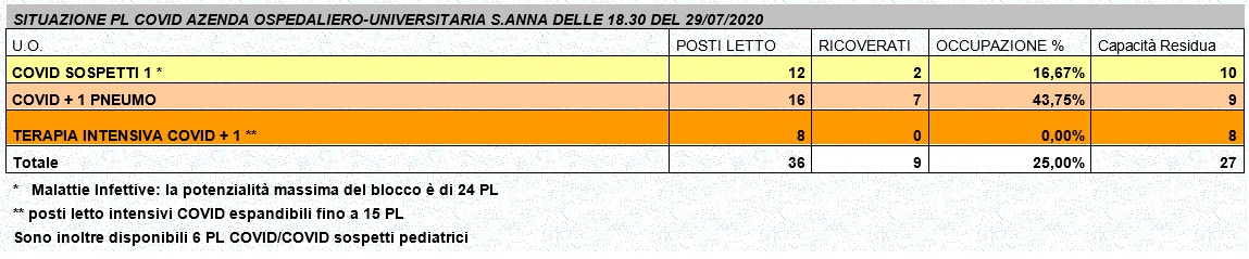 Situazione posti letto reparti Covid - 29 luglio 2020 - ore 18.30