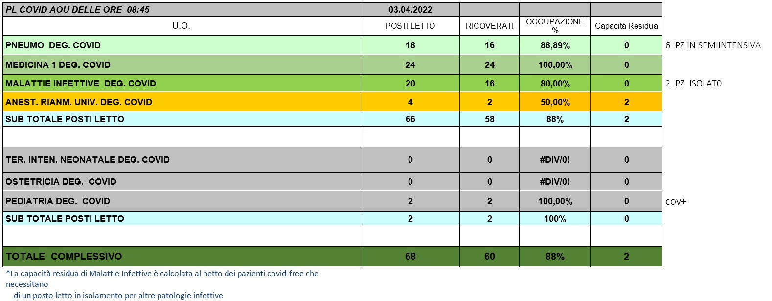 Situazione posti letto reparti Covid 3 aprile 2022 - ore 8.45.jpg