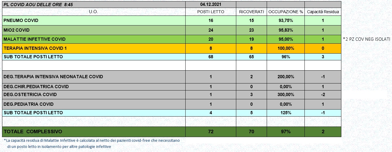 Situazione posti letto reparti Covid 4 dicembre 2021 - ore 8.45.jpg
