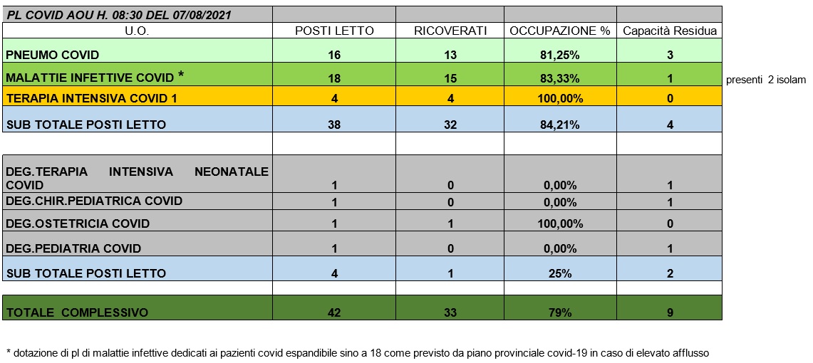 Situazione posti letto reparti Covid 7 agosto 2021 - ore 8.30.jpg