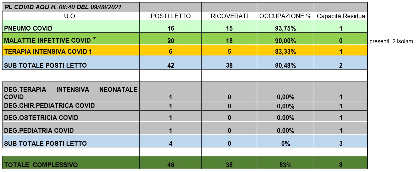 Situazione posti letto reparti Covid 9 agosto 2021 - ore 8.40.jpg