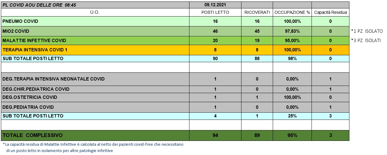 Situazione posti letto reparti Covid 9 dicembre 2021 - ore 8.45.jpg