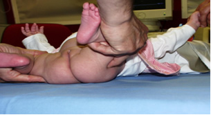 la minor apertura di un’anca rispetto all’altra. Segni di certezza sono le manovre di Ortolani e di Barlow per valutare la stabilità e la congruenza dell’articolazione. Le manovre di Ortolani e Barlow devono essere eseguite con tecnica precisa, possibilmente con il bambino tranquillo e rilassato ed è legata alla sensibilità ed esperienza dell’esaminatore. Consiste nell’ apprezzare con il tatto uno scatto quando la testa del femore supera il bordo acetabolare (fig. 11).