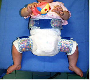 Man mano che ci si allontana dalla nascita diventa sempre più difficile sia riportare la testa femorale nella sua sede in modo stabile che ottenere la normale conformazione dei capi articolari atta a impedire ulteriori problemi. Nei casi più semplici, così come nel caso della displasia, può essere necessario utilizzare divaricatori a permanenza (Fig. 15)