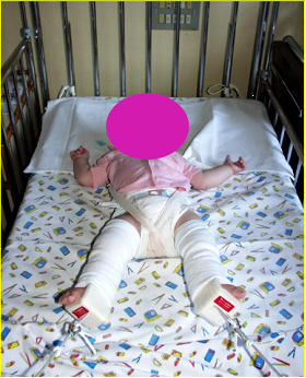 ma si può arrivare alla necessità di mettere il bambino in trazione (con pesi attaccati agli arti inferiori tramite cerotti) per diversi giorni (Fig. 16)
