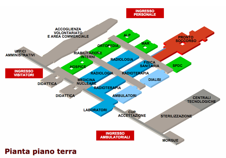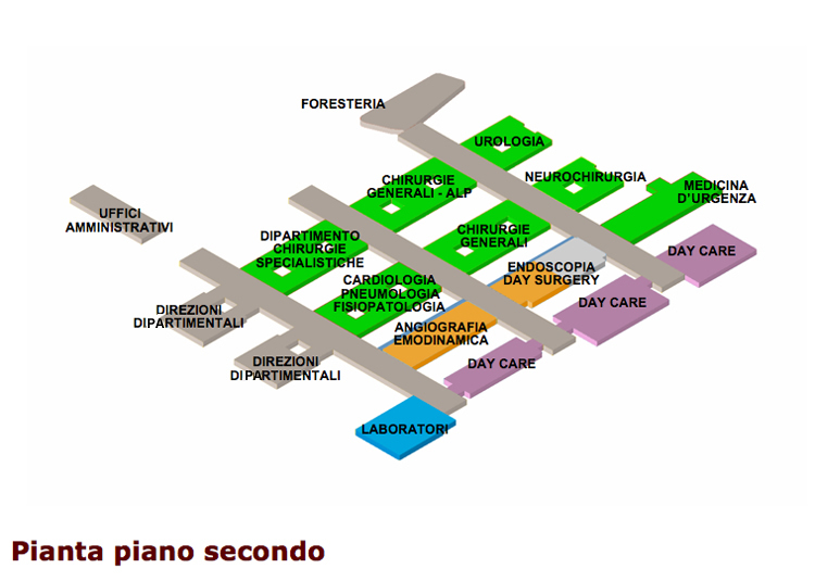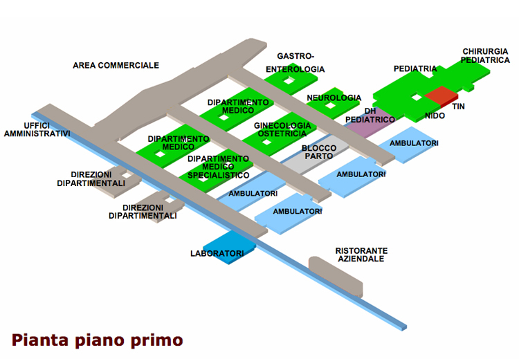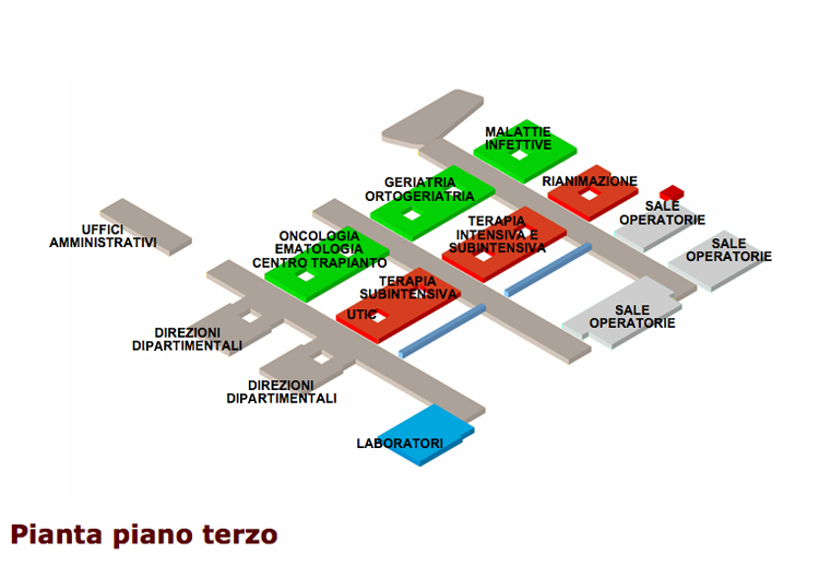 L'assetto distributivo delle funzioni è stato articolato per aree omogenee a diversa intensità di cura. In quest'ottica è stata prevista un'articolazione degli spazi che prevede un'unicità-continuità logistica per le funzioni di: